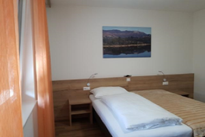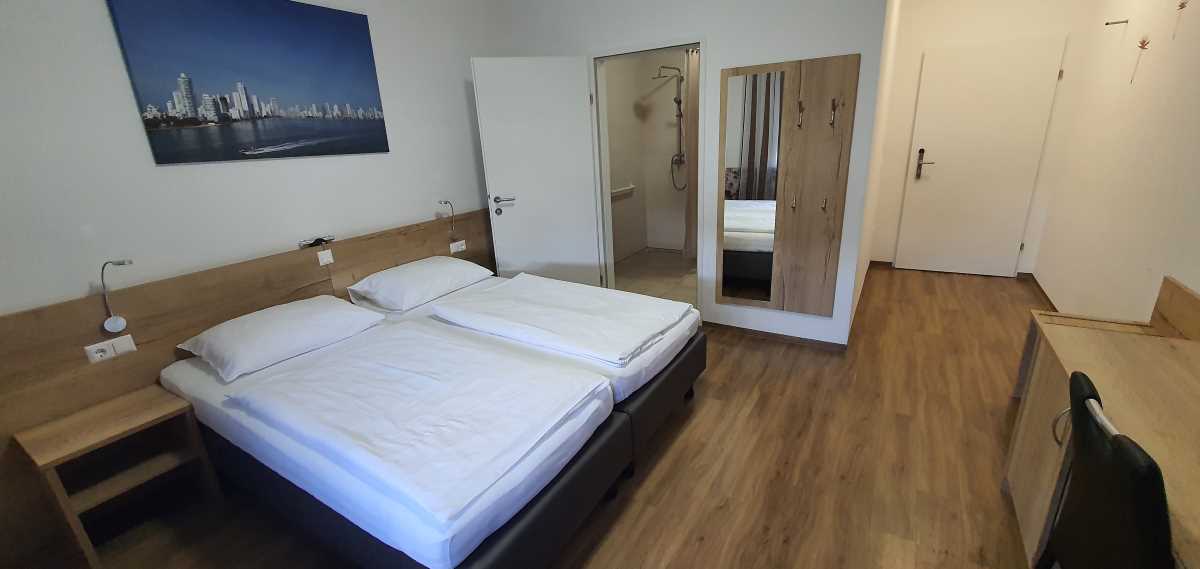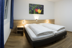 Unsere Doppelzimmer mit geräumiger Dusche/WC verfügen über eine Wohnraumlüftung, Fußbodenkühlung im Sommer, Netzwerkanschluss RJ45, gratis WLAN, Smart TV 48 Zoll, Kühlschrank, Safe, Föhn, usw.