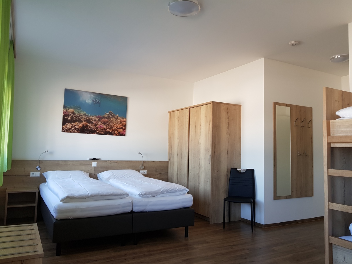 Unser Familienzimmer mit geräumiger Dusche/WC verfügt über eine Wohnraumlüftung, Fußbodenkühlung im Sommer, Netzwerkanschluss RJ45, gratis WLAN, Smart TV 48 Zoll, Kühlschrank, Safe, Föhn, usw.