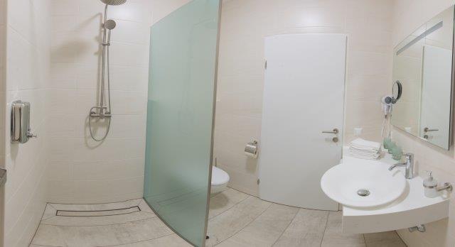 Unsere Rollstuhlgerechtes Zimmer mit Dusche/WC verfügt über eine Wohnraumlüftung, Fußbodenkühlung im Sommer, Netzwerkanschluss RJ45, gratis WLAN, Smart TV 48 Zoll, Kühlschrank, Safe, Föhn, usw.
