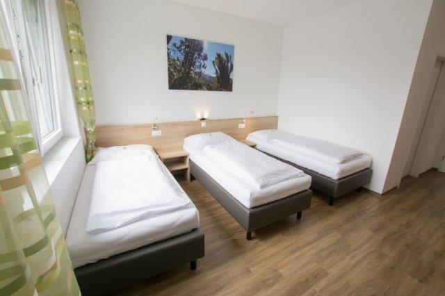 Unsere Dreibettzimmer mit geräumiger Dusche/WC verfügen über eine Wohnraumlüftung, Fußbodenkühlung im Sommer, Netzwerkanschluss RJ45, gratis WLAN, Smart TV 48 Zoll, Kühlschrank, Safe, Föhn, usw.